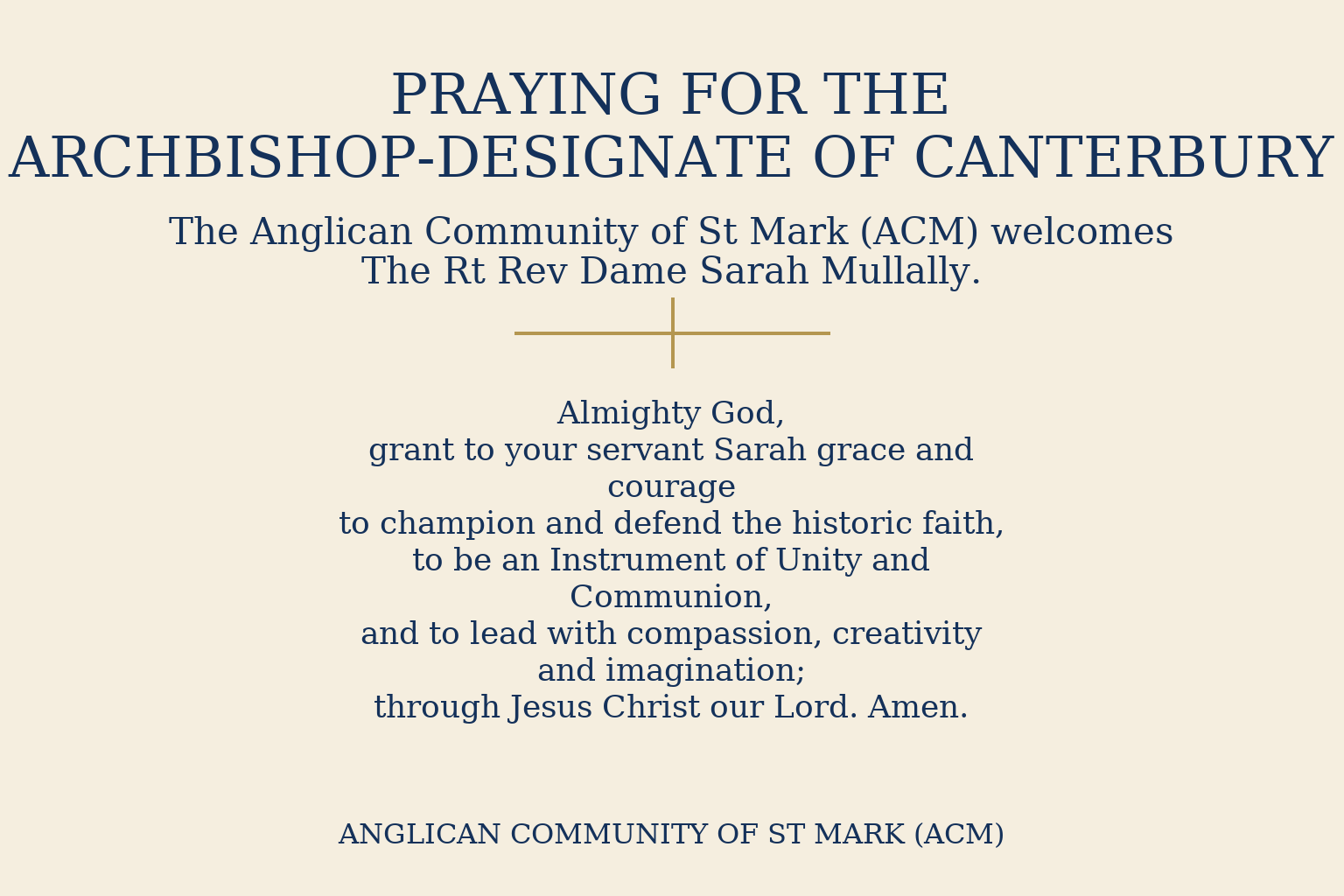 The Anglican Community of St Mark (ACM) warmly welcomes The Right Reverend and Right Honourable Dame Sarah Mullally as Archbishop-designate of Canterbury. Her nomination as the 106th Archbishop of Canterbury marks a historic moment for the Church of England, as she becomes the first woman to be called to this office.